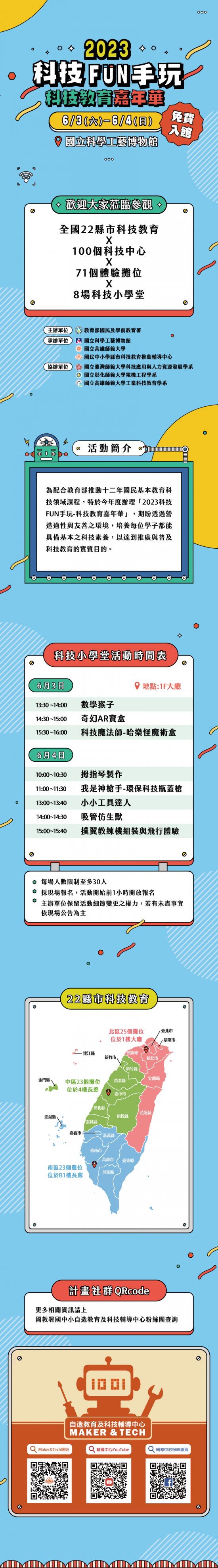 一、旨揭活動係由教育部國民及學前教育署主辦,本館與國立高雄師範大學共同承辦,活動內容包含全國 22 縣市科技教育及 100 個自造教育及科技中心年度成果展示,期盼藉此機會引發參與民眾與師生對於科技教育的興趣。 二、活動地點位於本館一樓大廳、地下一樓及四樓長廊,時間為 112 年 6 月 3 日(週六)上午 9 時至下午 5 時止,以及 6 月 4 日(週日)上午 9 時至下午 4 時止,活動期間免費入館,詳細活動流程資訊請參閱附件。 三、展示會場各參展單位提供科技教育教具與成品,供參觀民眾操作體驗,歡迎各級學校師生參觀。