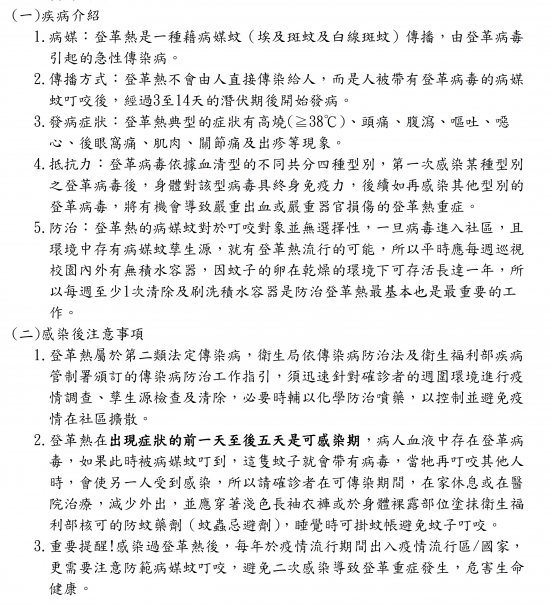 四、附件為台南市教育局登革熱宣導及疾病介紹,請下載參看,充實防疫知能。