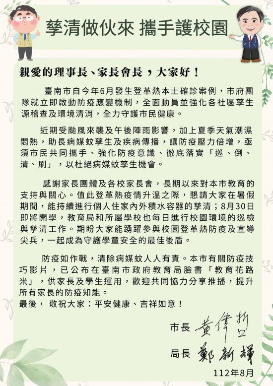 一、近期登革熱防疫工作,亟須市民共同攜手,為此,黃偉哲市長特別於開學前夕發送給各校家長會長及本市家長團體理事長「孳清做伙來、攜手護校園」一封信,全面動員守護學生健康。
