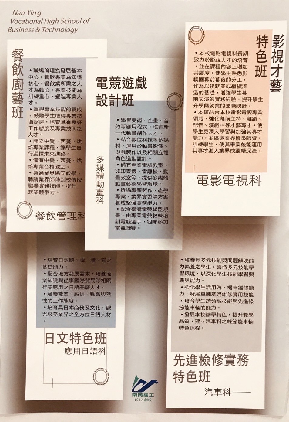 一、招生科班與名額及其他相關規定請參閱招生簡章。簡章內容可至本校網頁免費下載,網址 http://www.nyvs.tn.edu.tw/。南英商工首頁(校園佈告欄)─113 學年度特色招生專業群科甄選入學簡章及報名表。