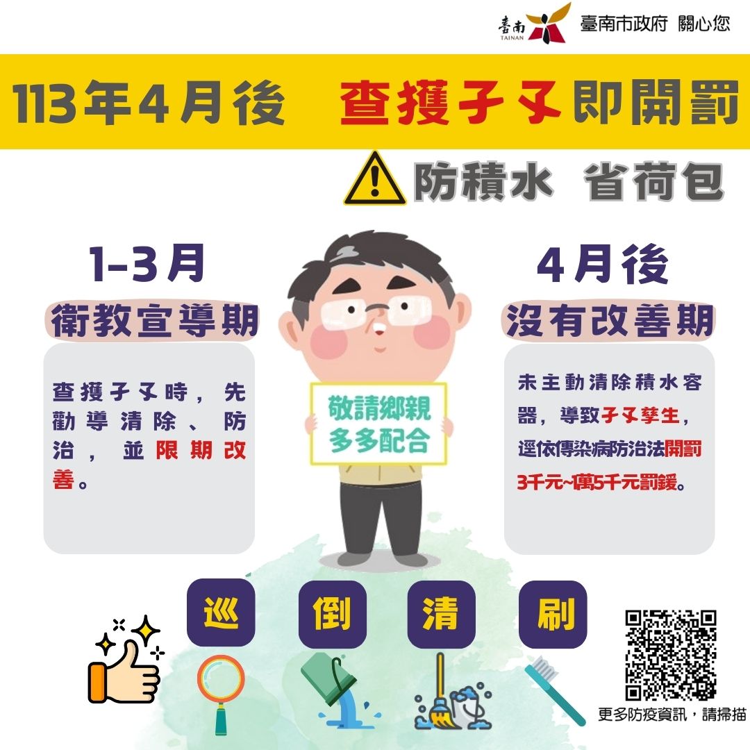 「臺南市於 113 年 1-3 月為登革熱防治衛教宣導期,若查獲孳生病媒蚊孑孓時,會先勸導清除及防治,並限期改善;但是,今(113)年 4 月 1 日後,民眾如未主動清除積水容器,導致積水處孳生病媒蚊孑孓,一經查獲,將逕依傳染病防治法開罰 3 千元到 1 萬 5 千元罰鍰,提醒您,家家戶戶落實「巡、倒、清、刷」,才能杜絕病媒蚊孳生,讓我們共同對抗登革熱,守護臺南健康家園!」等文字。