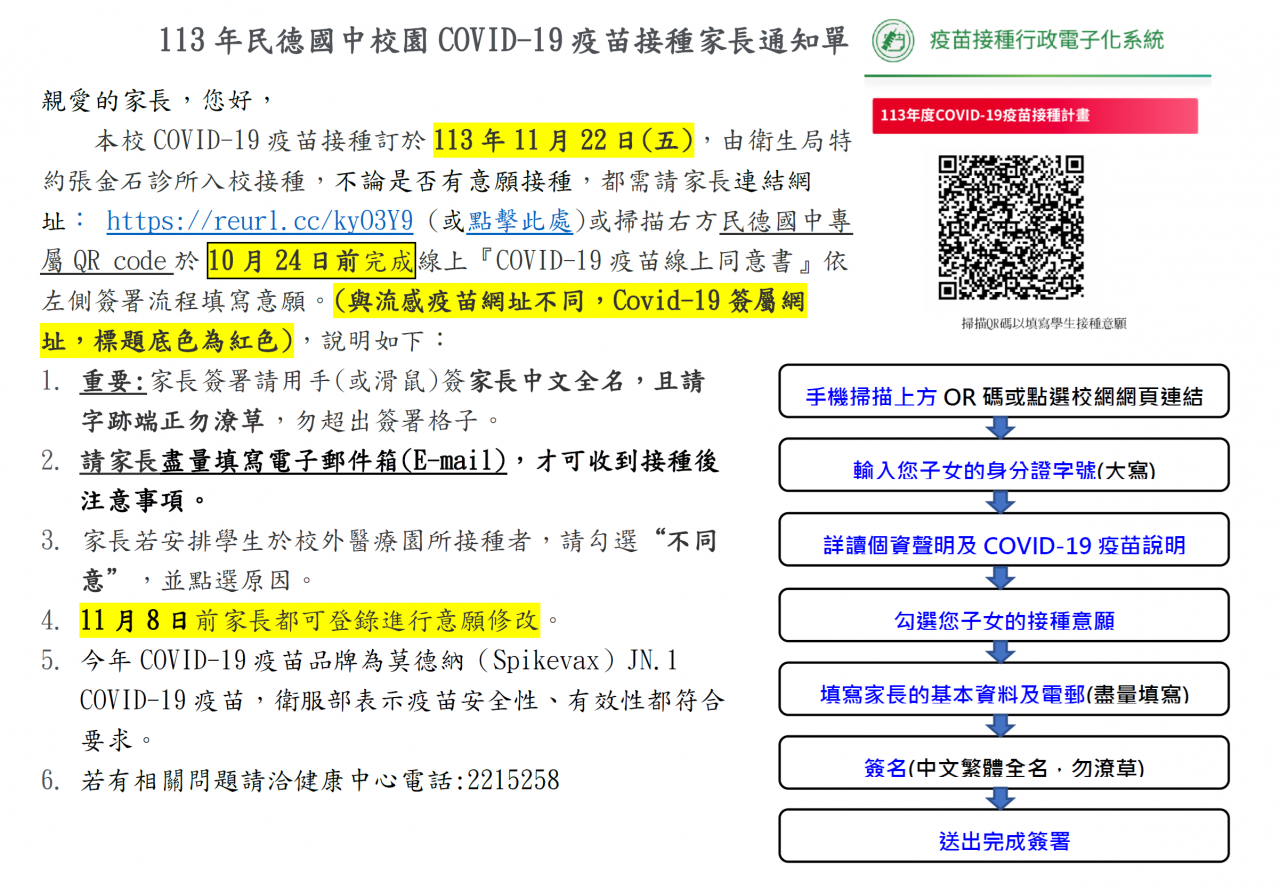 本校 COVID-19 疫苗接種訂於113年 11 月 22 日(五),由衛生局特約張金石診所入校接種,不論是否有意願接種,都需請家長連結網址: https://reurl.cc/kyO3Y9 (或點擊此處)或掃描附件中民德國中專屬 QR code,並於10/24 前完成線上『COVID-19 疫苗線上同意書』依左側簽署流程填寫意願。