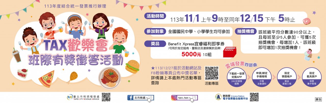 五、活動詳情請參閱活動網頁(網址: https://services. arpa.tpctax.dof.gov.taipei/act/113taxfun/)。