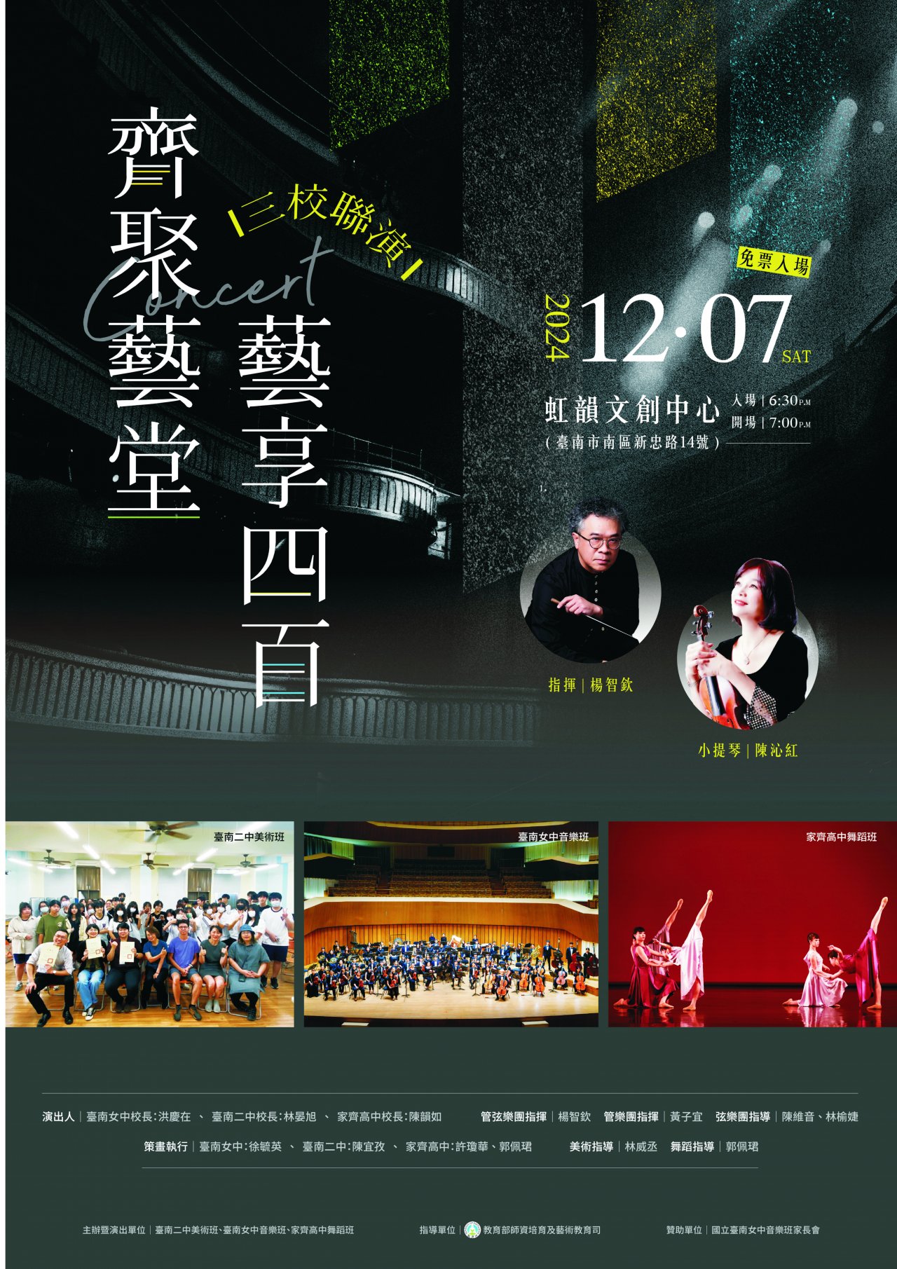 一、 2024 年適逢臺南建城四百年,文化氣息濃厚的府城,孕育多元藝術發展,本市設置有美術、音樂、舞蹈等不同教育 階段藝才班,臺南二中美術班、臺南女中音樂班、家齊高 中舞蹈班等高中階段藝才班建校多已達百年歷史,為慶祝 臺南建城四百年與各校建校達百年,三校特別選在虹韻文 創中心辦理「齊聚藝堂-藝享四百」聯合演出共同慶祝,以 及藉此活動展現臺南在地藝才班教育特色與輝煌成果,讓 藝才教育更加茁壯。鼓勵學生參與觀賞此 表演。