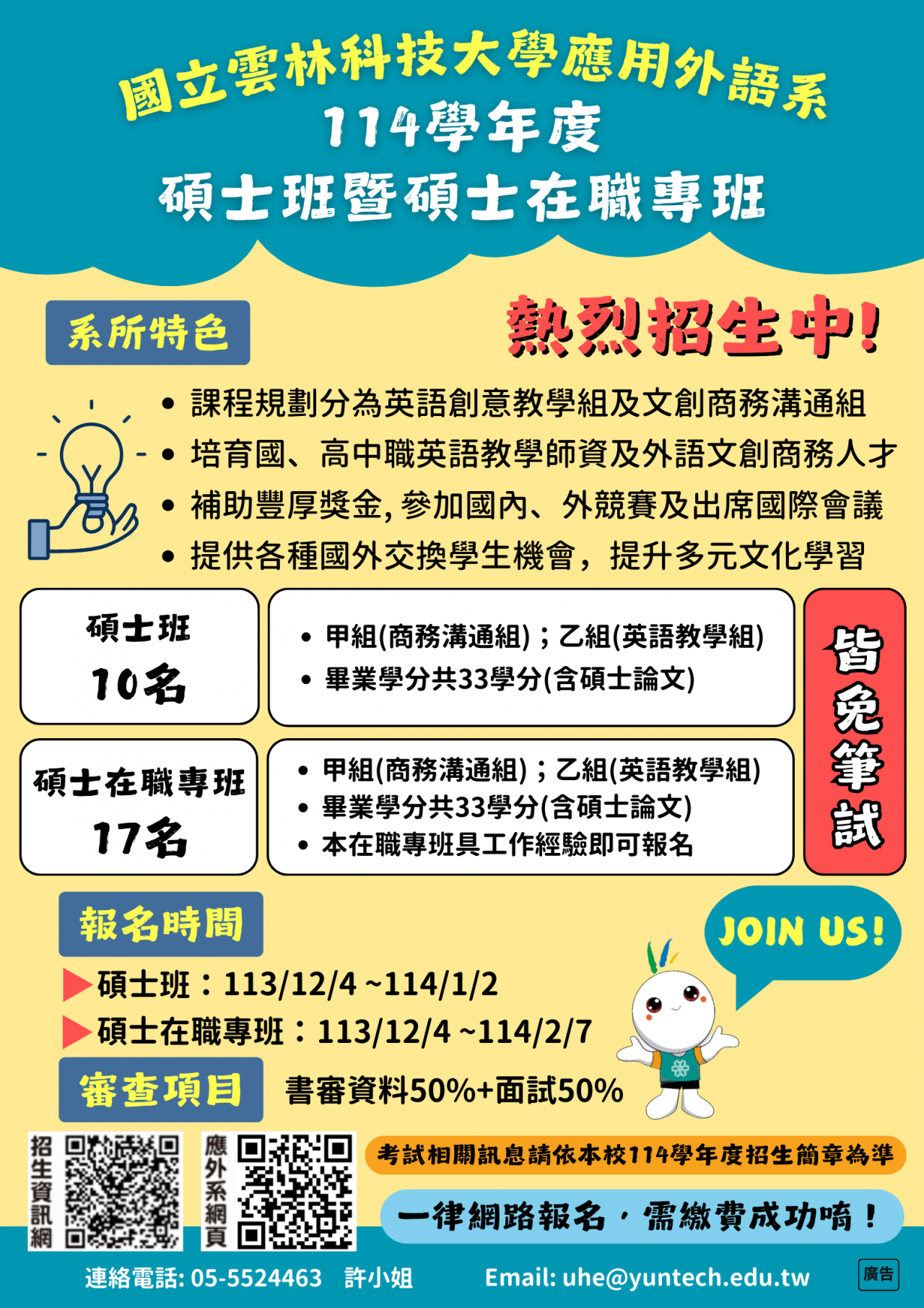 轉知-國立雲林科技大學應用外語系碩士在職專班及推廣碩士學分班招生訊息