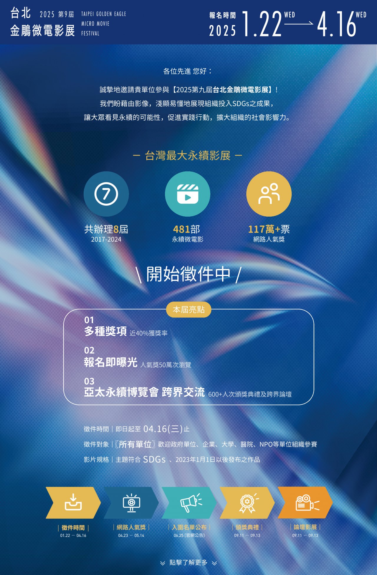 三、為擴散永續微電影的影響力,本會持續舉辦第九屆台北金鵰微電影展,徵件時間從即日起至 4 月 16 日(星期三)止,並結合「亞太永續博覽會」辦理頒獎典禮與影展,表揚致力於多元利害關係人溝通的組織,希望藉由博覽會舞台及社群宣傳曝光,讓大眾看見各界投入永續之豐碩成果。