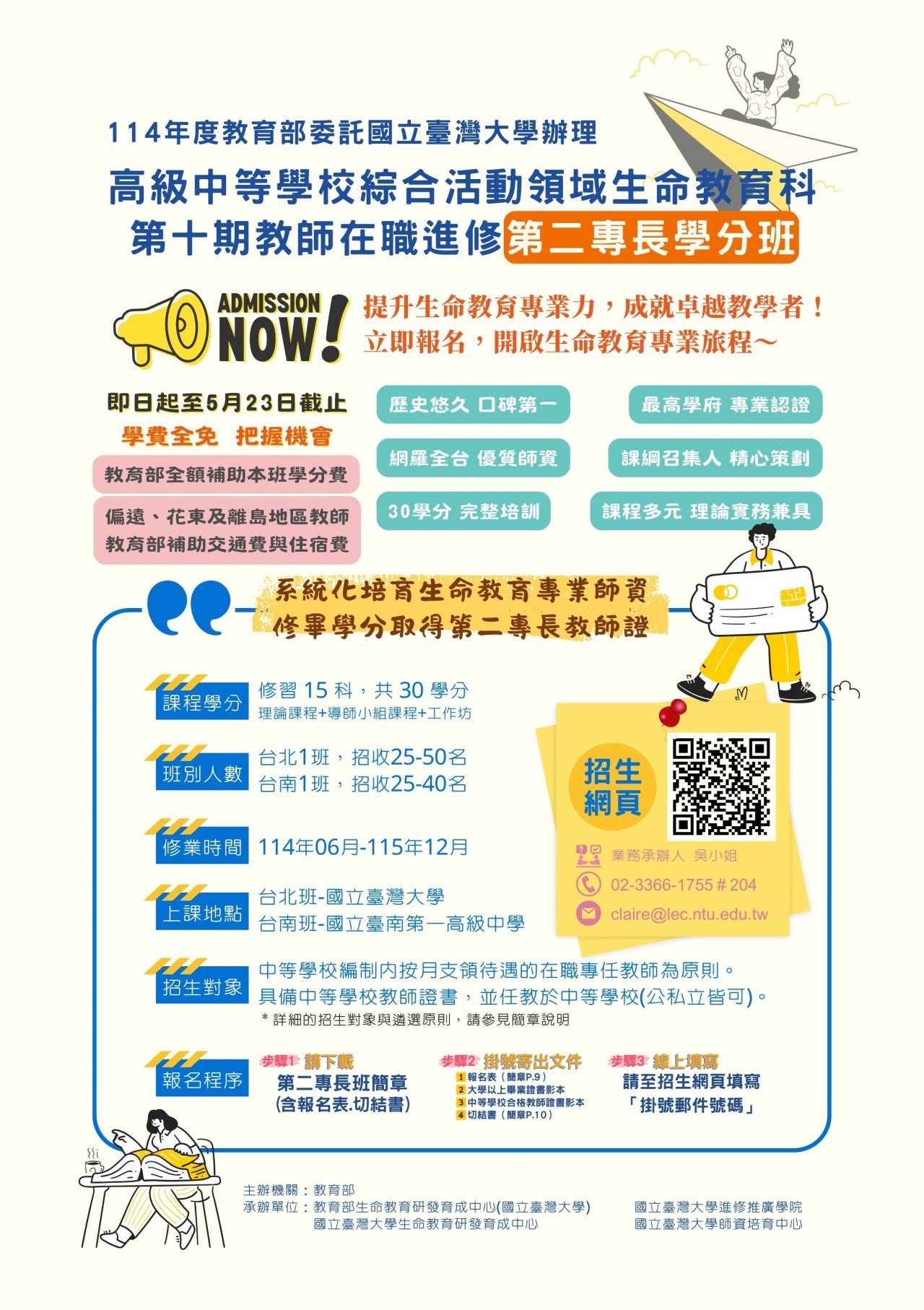 二、為落實十二年國民基本教育課綱精神,培育高級中等學校生命教育科專業師資,教育部特委託本校生命教育研發育成中心辦理旨揭學分班。