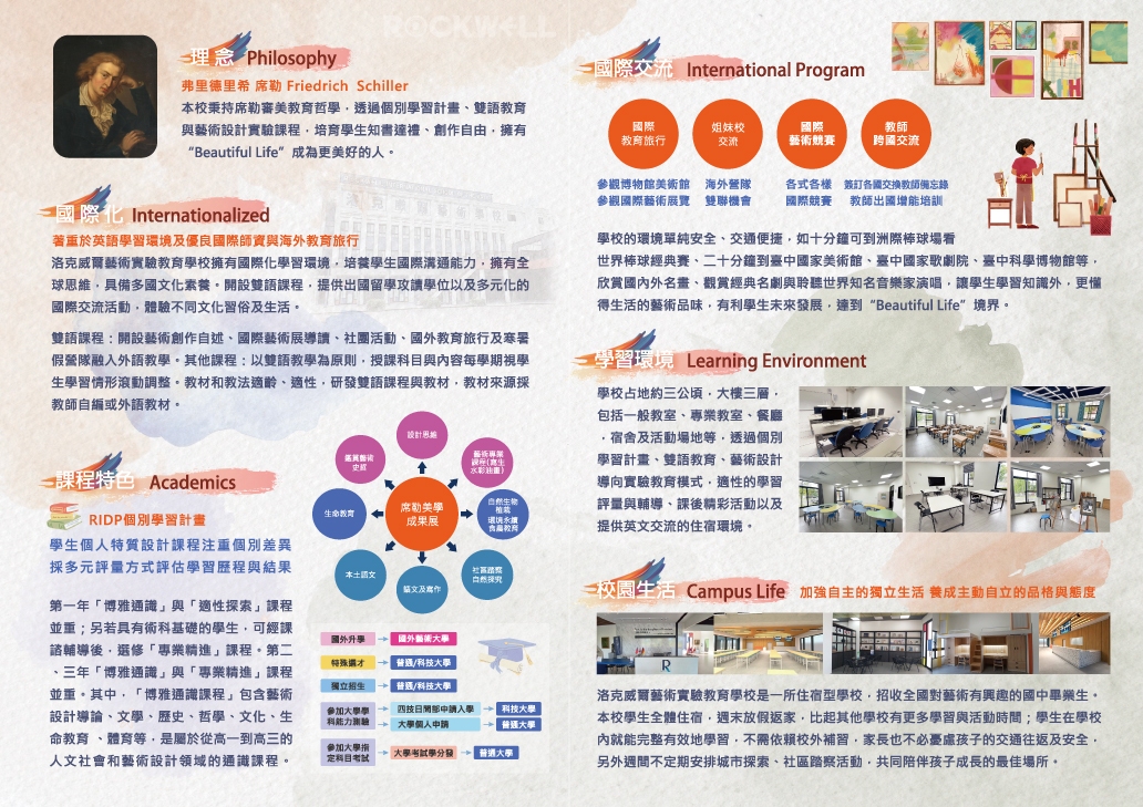 二、學校為「學校型態」實驗高中,秉持席勒審美教育哲學,透過個別學習計畫及藝術設計導向實驗教育模式,結合語言學習與藝術教育的住宿環境,勾勒出美力、品格力及國際移動力的學生圖像。