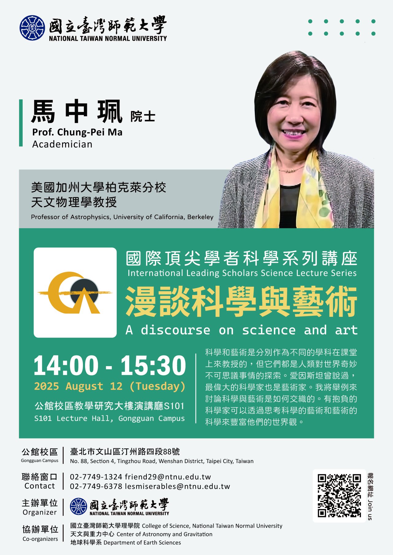 二、本場講座擬邀請美國加州大學柏克萊分校天文物理學教授馬中珮院士擔任講者;講座資訊如下: