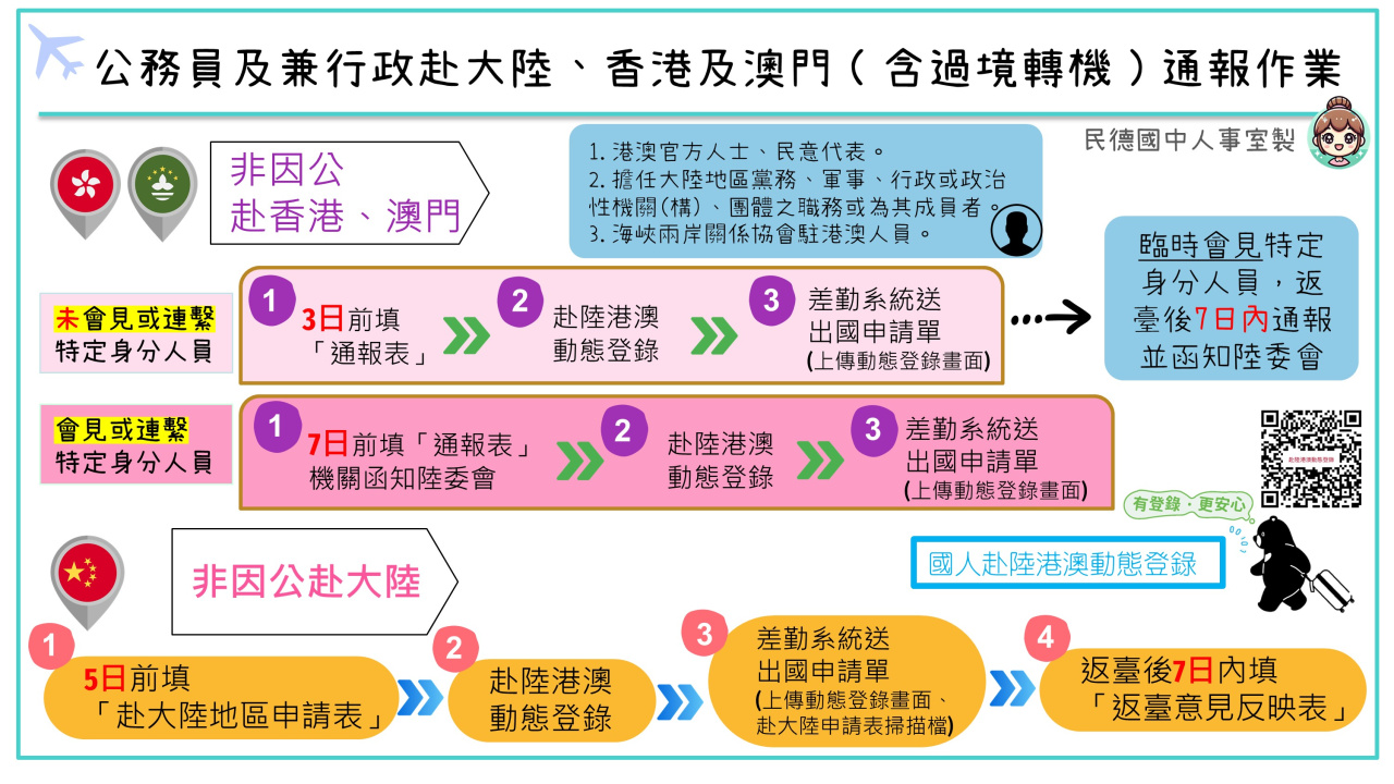 (一)依「行政院及所屬各機關公務人員因公赴香港澳門通報作業要點」、「行政院及所屬各機關(構)人員赴香港或澳門注意事項」,不分平、假日赴港澳,行前應至人事差勤系統完成登錄,且不論公務或非公務事由,均應至大陸委員會「國人赴陸港澳動態登錄系統」進行登錄,並影送所屬機關(構)留存。
