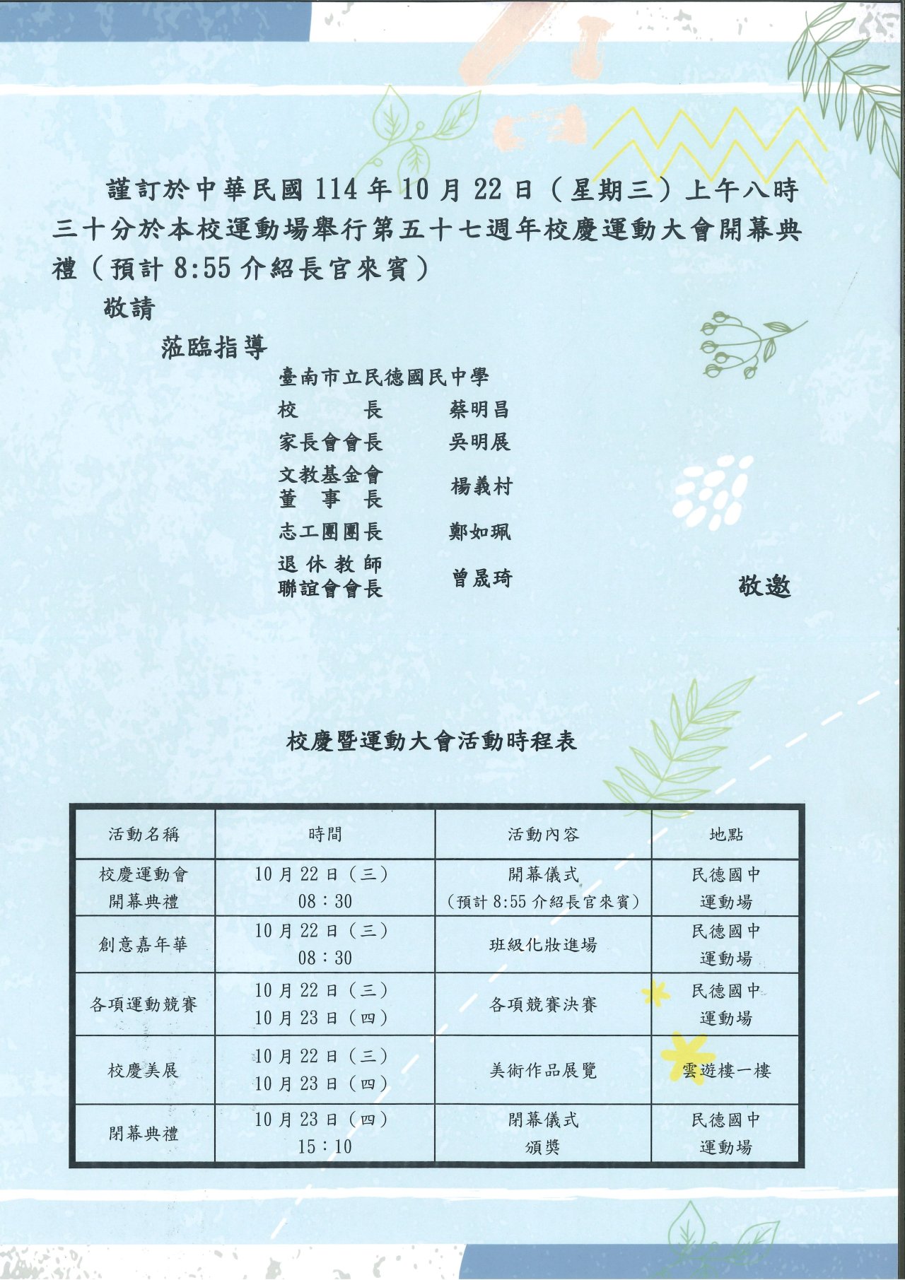 本校將於 114 年 10 月 22 日(三)及 10 月 23 日(四)辦理 57 週年校慶暨運動大會