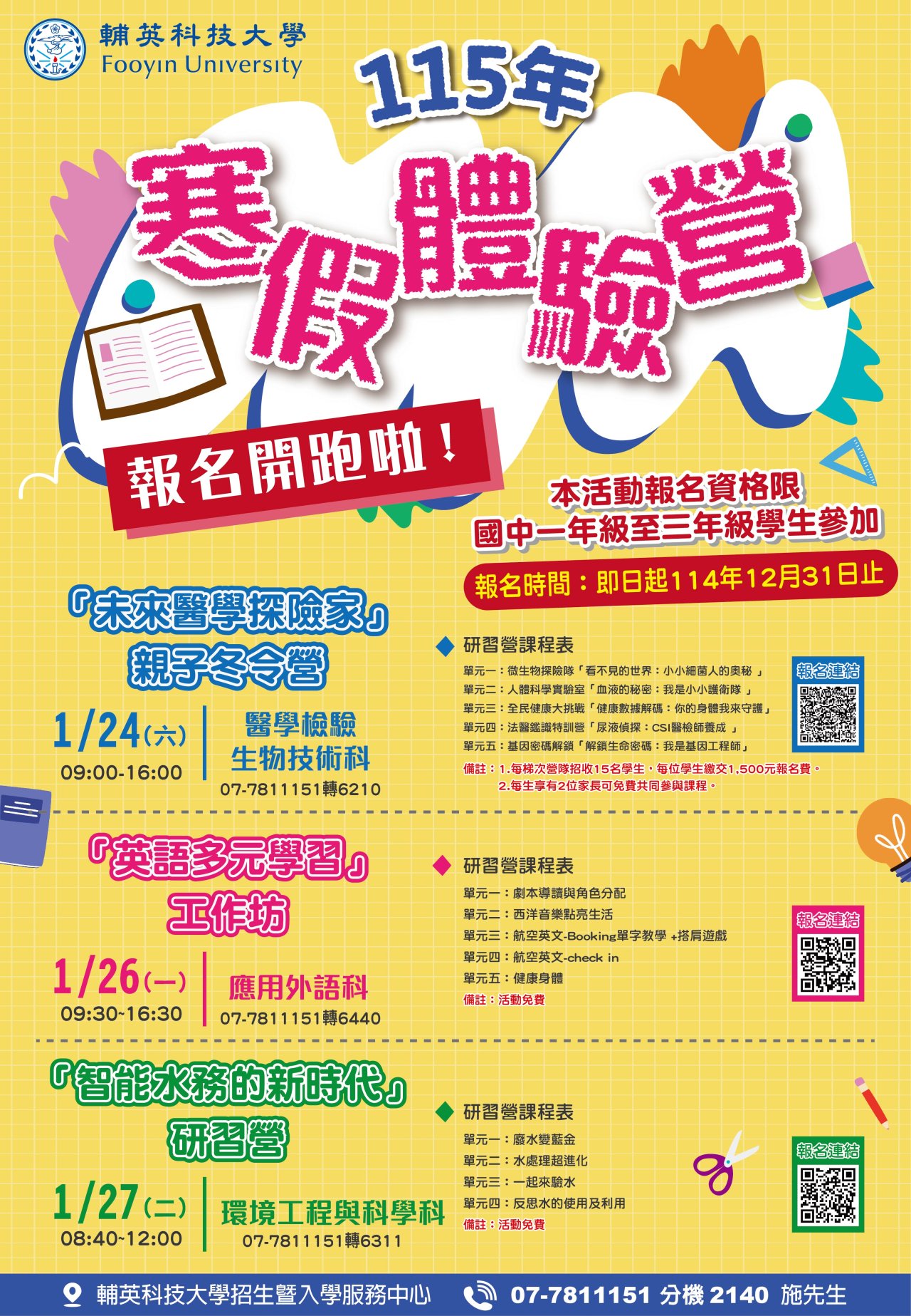 (六)報名方式:請掃描海報上各營隊 QR CODE 或至輔英科技大學首頁/招生資訊網/研習營( https://recruit.fy.edu.tw/p/412-1087-13065.php?Lang=zh-tw ),點選連結報名