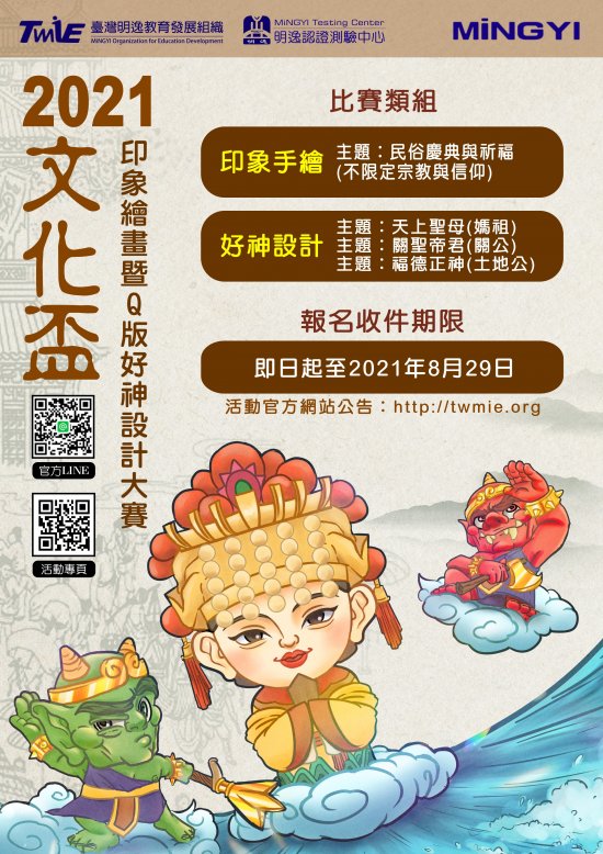 一、旨揭「2021 MiNGYI 文化盃印象繪畫暨 Q 版好神設計大賽 (下稱:本競賽),本競賽鼓勵學子以電腦或手繪方式創 作,透過不同主題表現宗教文化建築、神像、文物、民俗 活動或慶典之美,藉由本活動發想創作提升民眾宗教文化 藝文素質。相關說明如下: (一)參加資格:喜愛設計創作之個人,不限年齡、經歷,皆 可參加。 (二)報名費用:免費 (三)組別:印象手繪組、 Q 板好神設計組。 (四)本屆指定主題: 1、印象手繪組:民俗文化之美-信仰。 2、 Q 板好神設計組:天上聖母-媽祖、關聖帝君-關公、福 德正神-土地公。 檔 號: 保存年限: 6