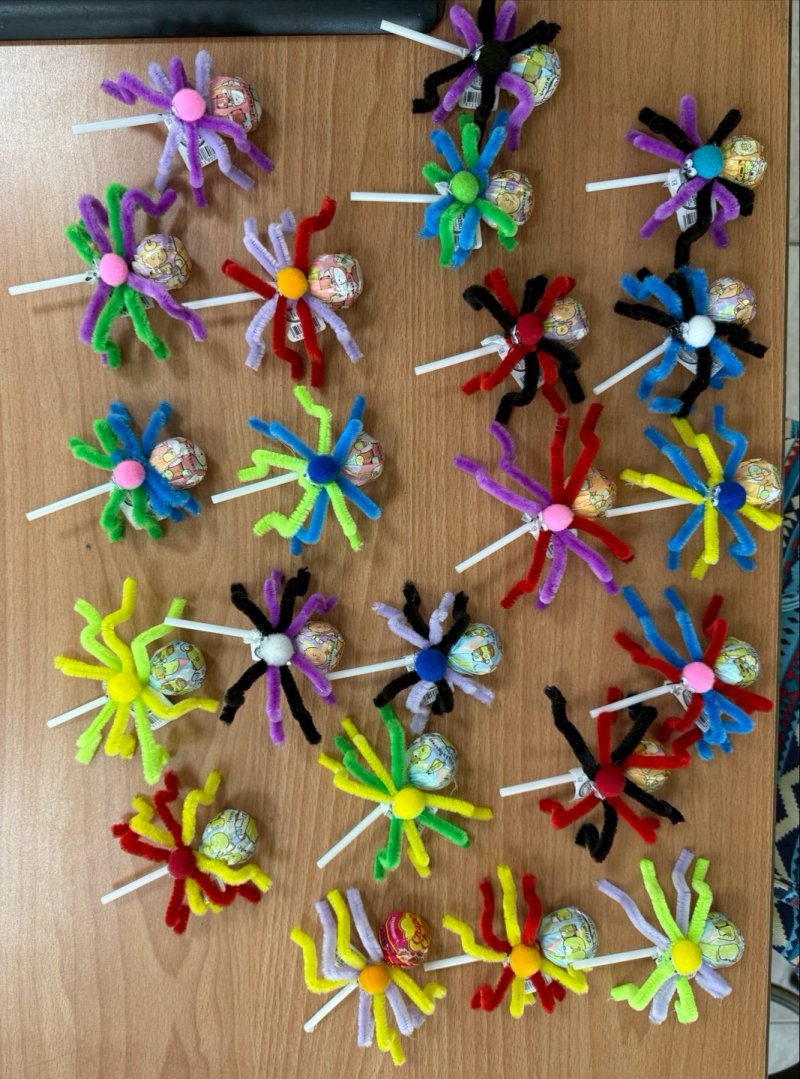 本校課後照顧班結合節慶文化與創意手作,每週一、週四均安排富有趣味的手作課程。十月份特別融入萬聖節 trick or treat 的歡樂氛圍,讓孩子在輕鬆創作中感受節慶魅力。課程中運用毛根搭配棒棒糖,設計了「蜘蛛棒棒糖」與「魔法掃把」等萬聖節造型小物,孩子們在動手製作的過程中,不僅培養美感與手部精細動作,也從作品中獲得成就感與分享的喜悅。