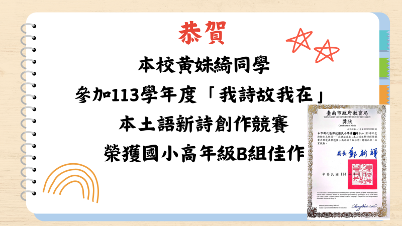 本校黃姝綺同學參加113學年度「我詩故我在」本土語新詩創作競賽榮獲國小高年級B組佳作