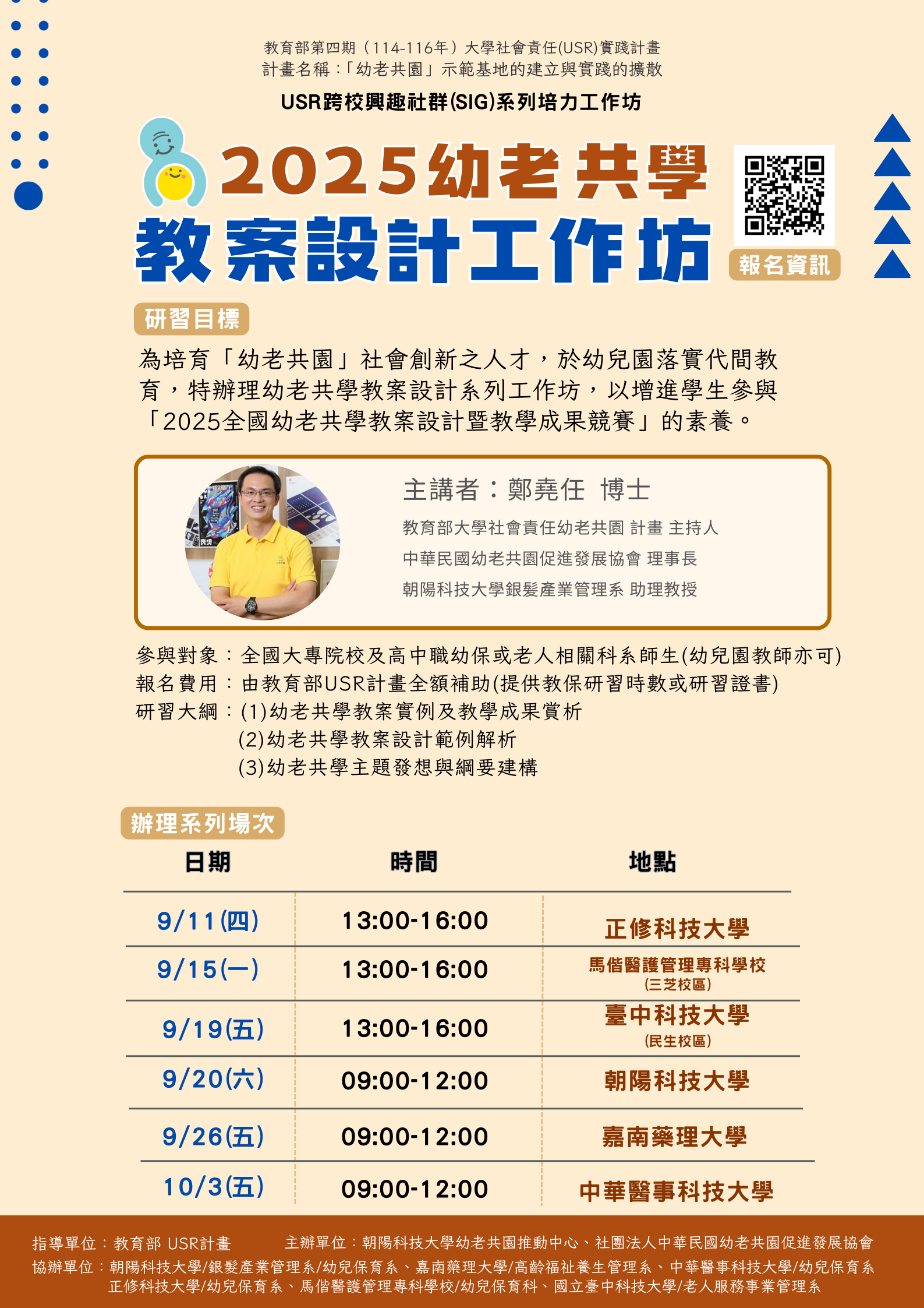 一、本校執行教育部大學社會責任( USR )實踐計畫,為協助提升「2025 全國幼老共學教案設計暨教學成果競賽」參賽者之投稿質量,掌握教案設計主題方向與方法,並理解幼老共學之代間教育價值,特舉辦旨揭系列培力工作坊。
