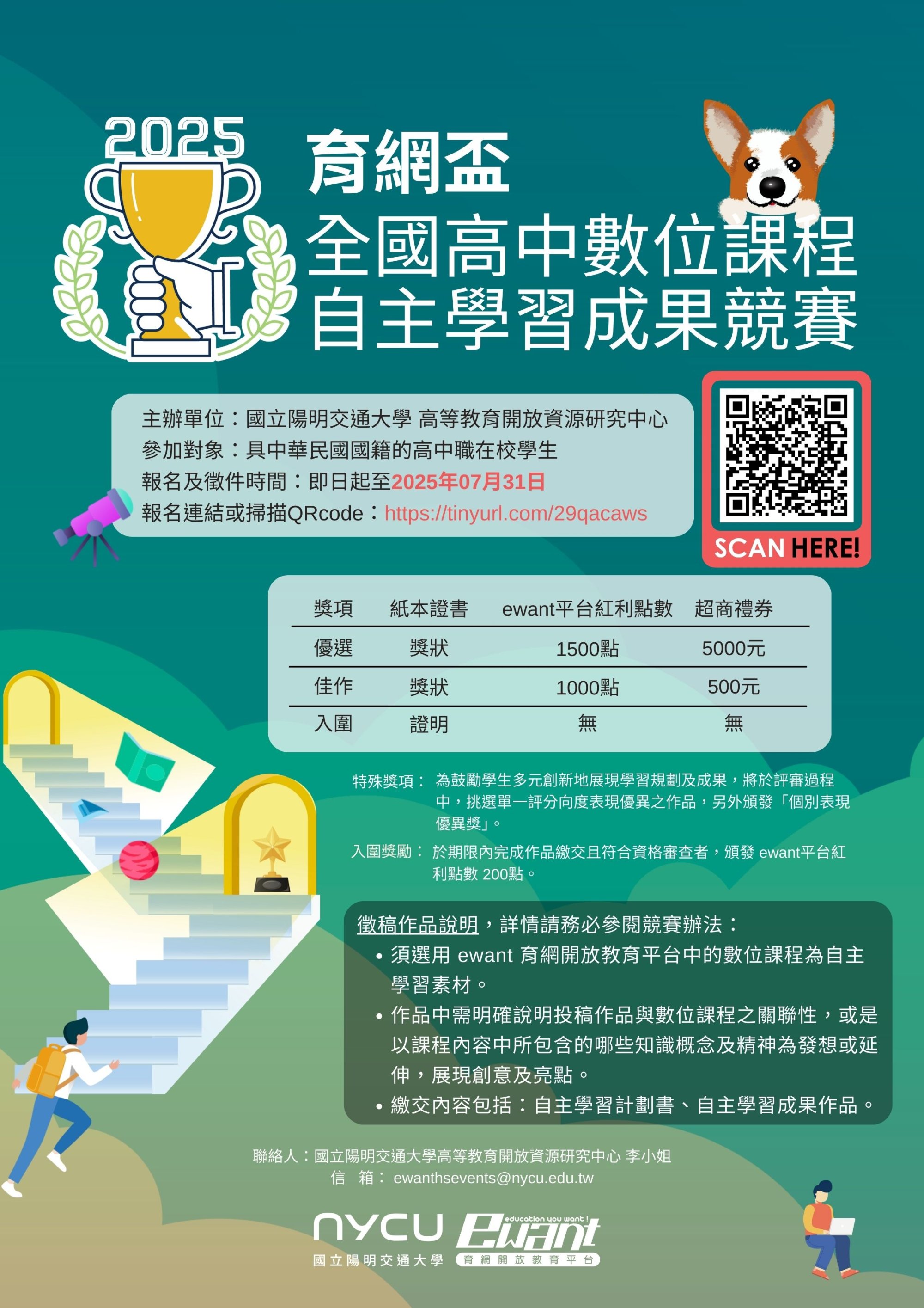 主旨:陽明交通大學舉辦「2025 育網盃全國高中數位課程自主學習成果競賽」,敬請鼓勵學生踴躍報名參加,請查照。