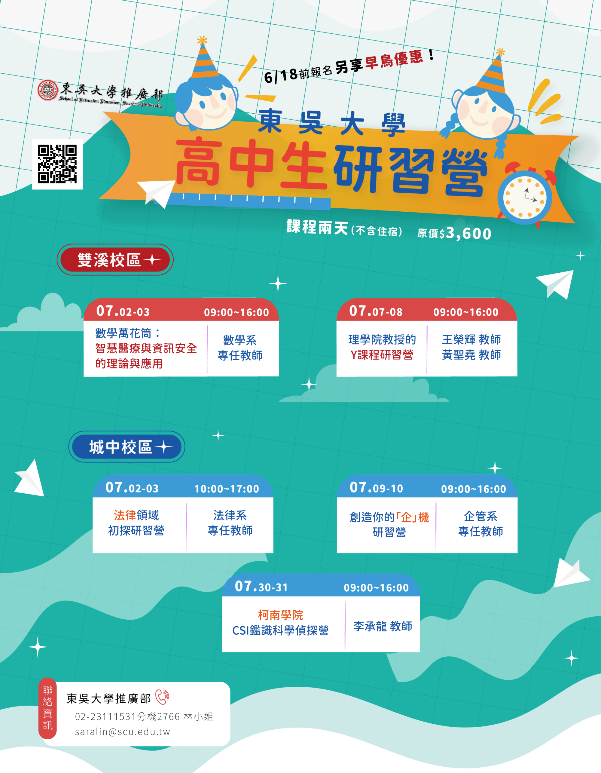 一、本次共計招生五個研習營:法律領域初探研習營、數學萬花筒:智慧醫療與資訊安全的理論與應用、理學院教授的 Y 課程研習營、探索成為東吳企管人、柯南學院 CSI 鑑識科學偵探營。