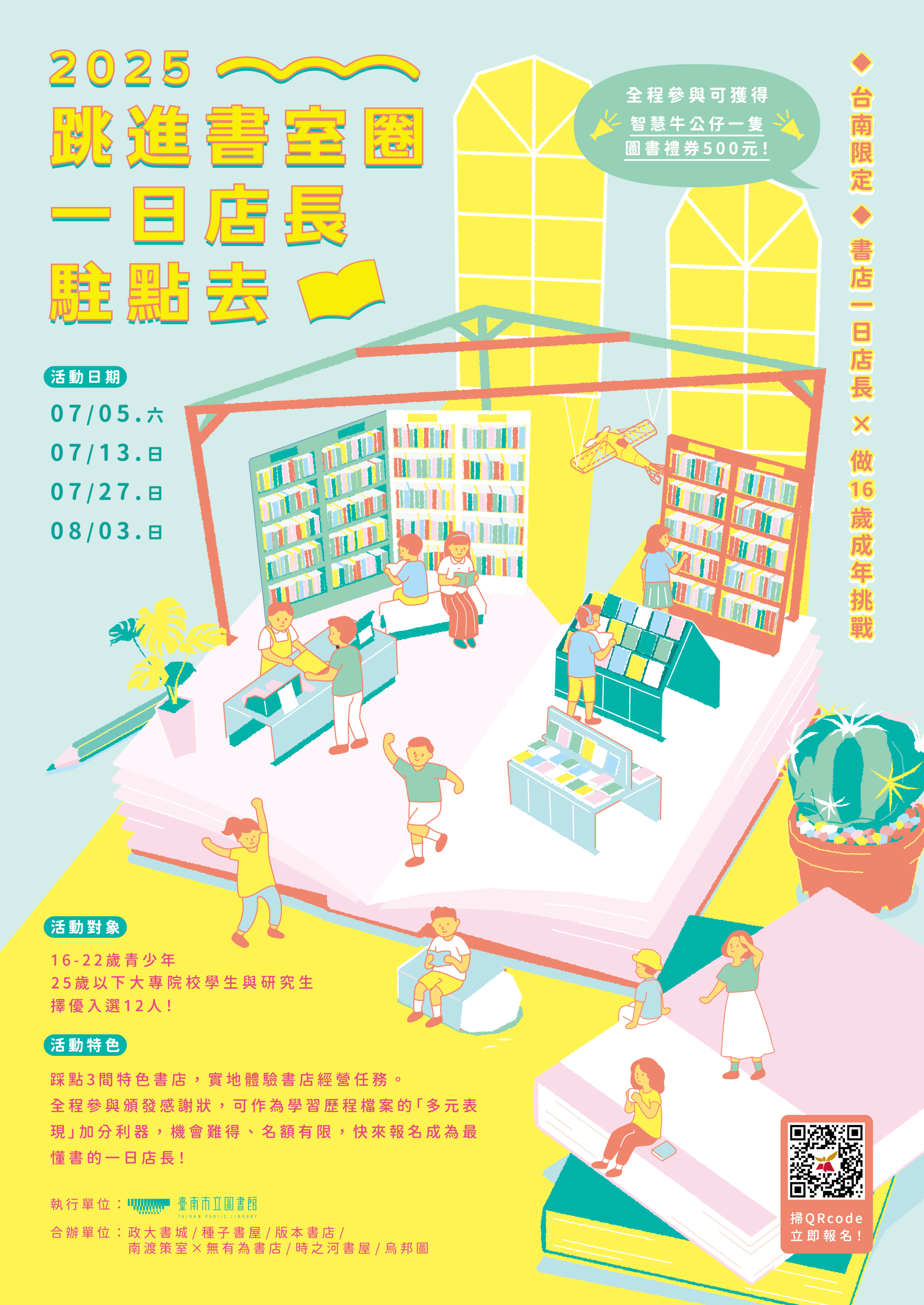 一、為培養青少年養成閱讀習慣、提升自我認識,並推動本市實體書店營運,本館擬連結青少年與本市書店,結合台南傳統文化「做 16 歲」成年禮,徵求青少年走入書店作為一日店長,期望藉由青少年在書店的認識與學習,作為成年禮里程碑。