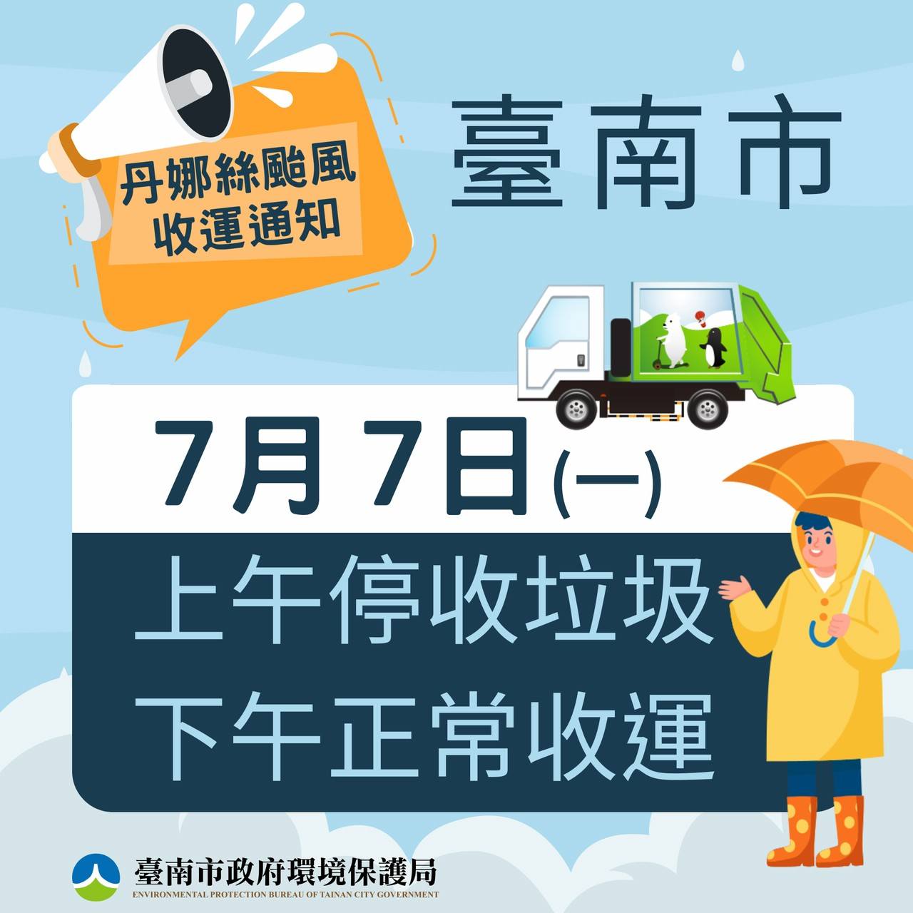 受中度颱風丹娜絲影響,臺南市今晚至明(7)日凌晨將有明顯風力及強降雨,且濱海地區風勢較強,恐有致災之虞,為維護市民安全及災後復原,臺南市政府 6 日晚上八點宣布,明(7)日停止上班、停止上課。