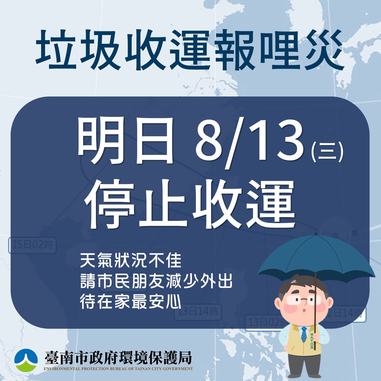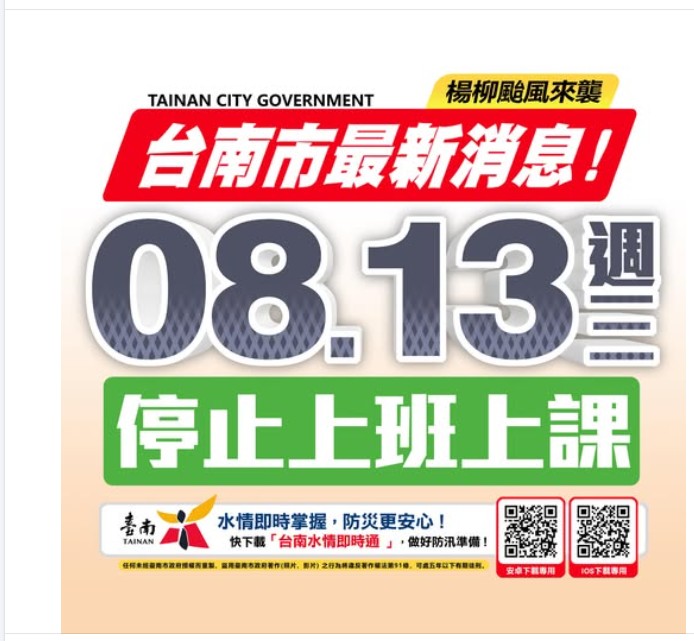 根據中央氣象署資訊發布,陸上強風特報,颱風及其外圍環流,明(13)日晨至 13 日晚上,台南市有平均風 9 級以上或陣風 11 級以上發生的機率,考量風力有危及市民上班上課安全或有致災之虞,為維護民眾安全及各項整備應變作為,明(8/13 )日停止上班、停止上課。