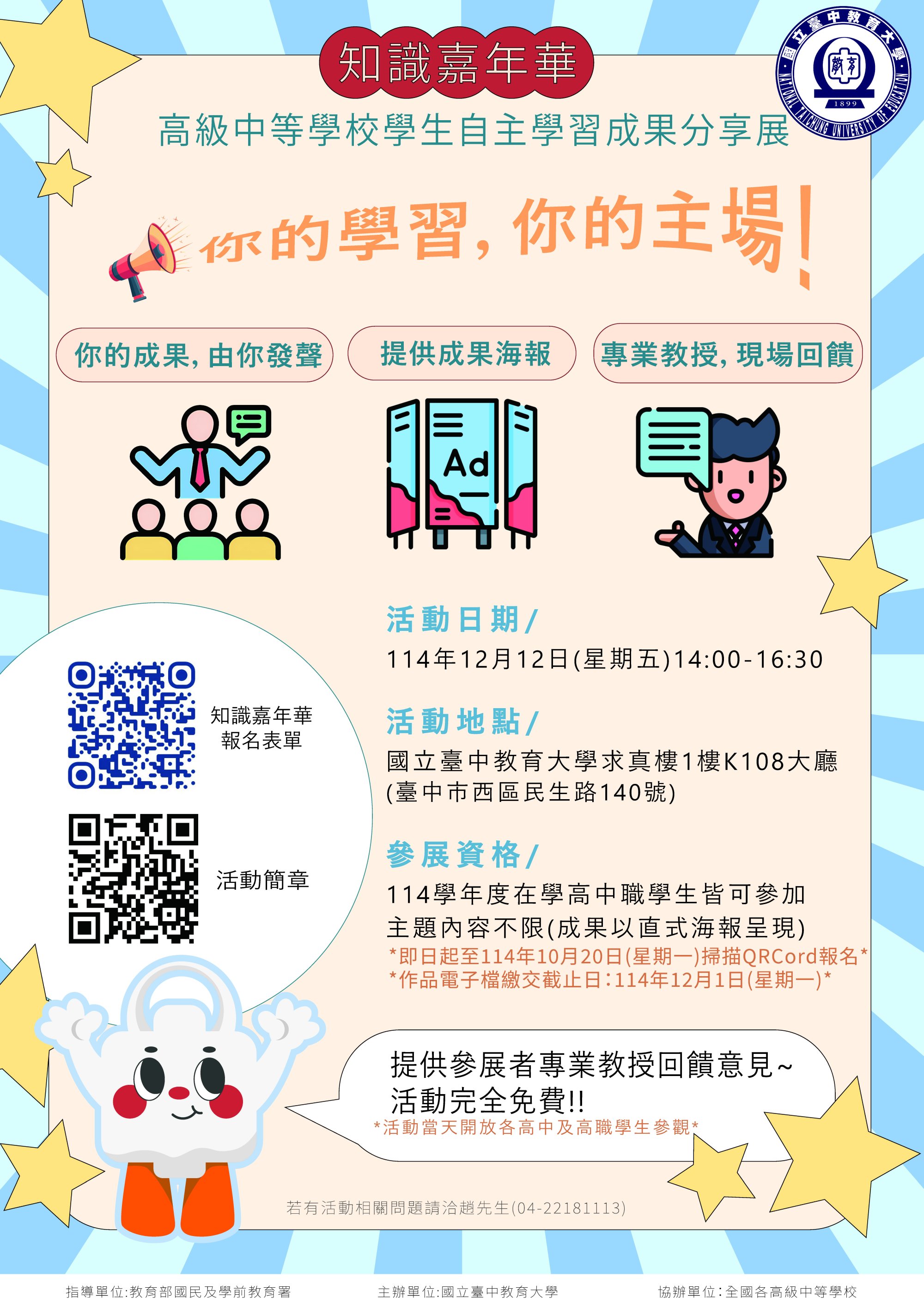 • 活動日期地點: 114 年 12 月 12 日(星期五)14:00-16:30 ,國立臺中教育大學求真樓 1 樓 K108 大廳。