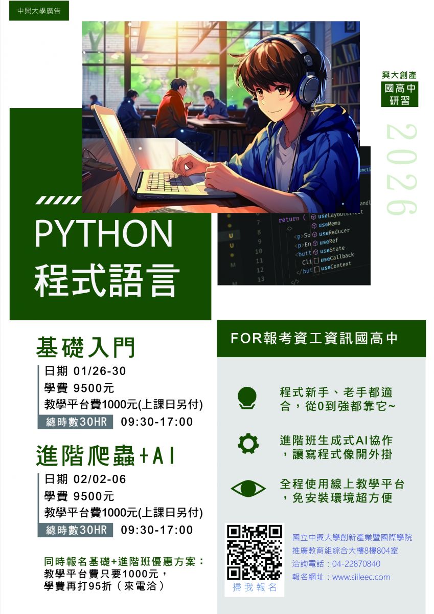 國立中興大學 2026 年寒假 Python 程式設計系列、 ACP 與 SSE 色彩學國際證照輔導、 AI 應用故事 X 探索島系列招生海報與簡章,即日起開放報名,請惠予公告周知,並轉知貴校學生踴躍報名參加。