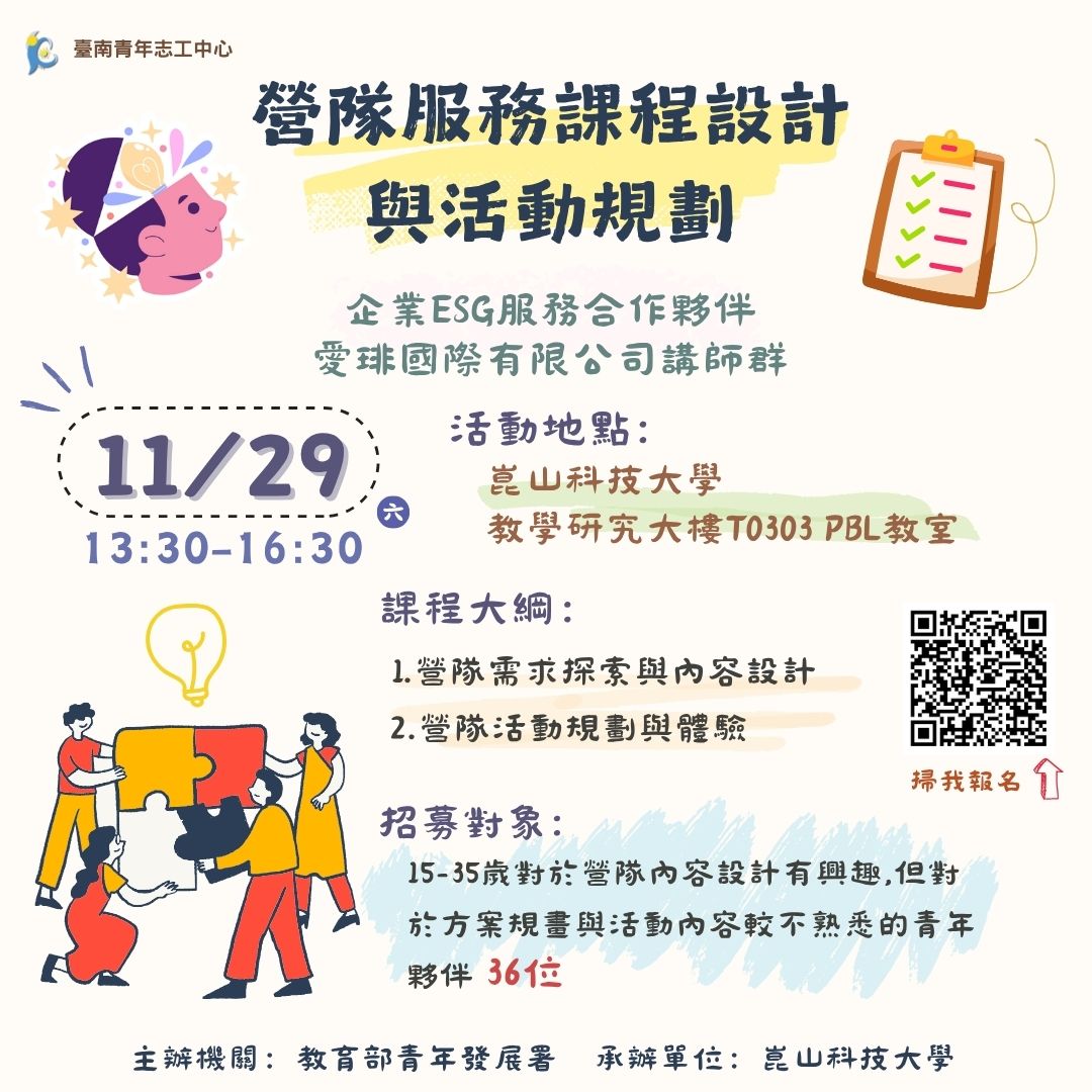 一、培訓目的:期待透過此培訓讓青年夥伴理解營隊設計背後的核心思維,從需求探索到內容發想,再到活動規劃與帶領體驗,培養能獨立設計並執行完整營隊的能力。