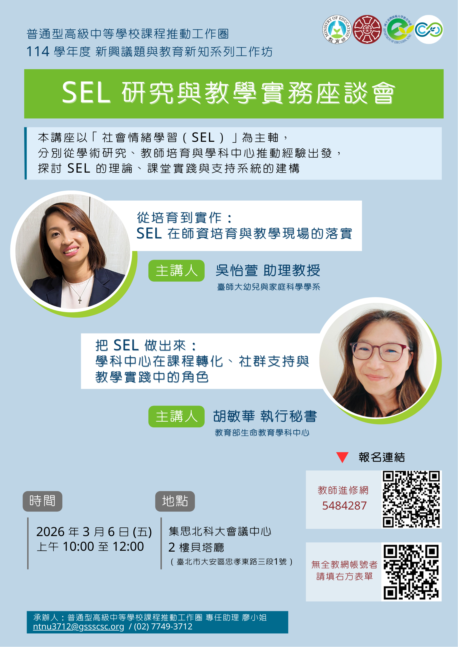 一、旨揭活動係教育部國民及學前教育署委託本校教育學系教育專業發展中心辦理,邀請來自國立臺灣師範大學幼兒與家庭科學學系吳怡萱助理教授、教育部生命教育學科中心胡敏華執行秘書,以「社會情緒學習( SEL )」為主軸,分別從學術研究、教師培育與學科中心推動經驗出發,探討 SEL 的課堂實踐與支持系統的建構。
