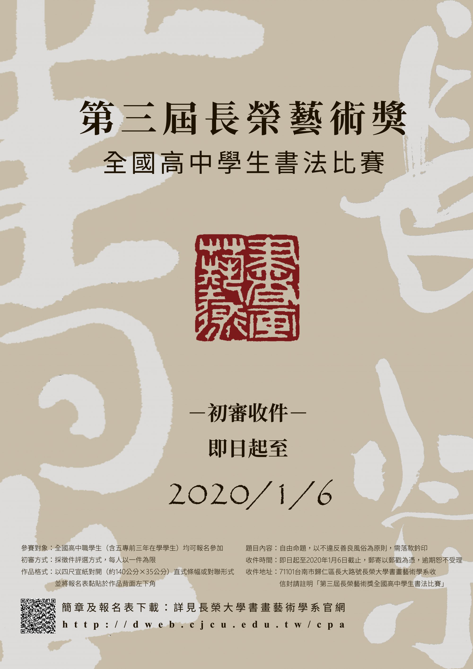 二、比賽採初選與決賽兩階段進行,自即日起至 109 年 01 月 06 日(星期一)截止收件,決賽則於 109 年 02 月 22 日(星期六)舉行。詳細比賽辦法及海報如附件或至本校書畫藝術學系( https://dweb.cjcu.edu.tw/cpa/main )下載。