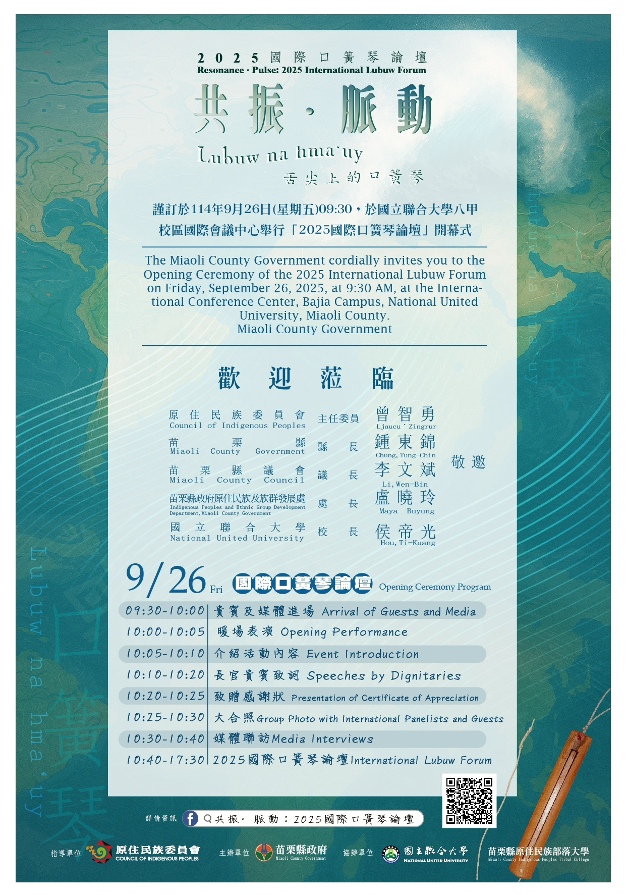一、為推廣泰雅口簧琴(Lubuw)文化,落實教育推廣促進跨域交流,苗栗縣政府訂於 114 年 9 月 26 日(星期五)至 114 年 9 月 28 日假苗栗縣內舉行「共振 · 脈動: 2025 國際口簧琴論壇-Resonance · Pulse : 2025 International Lubuw Forum」系列活動。