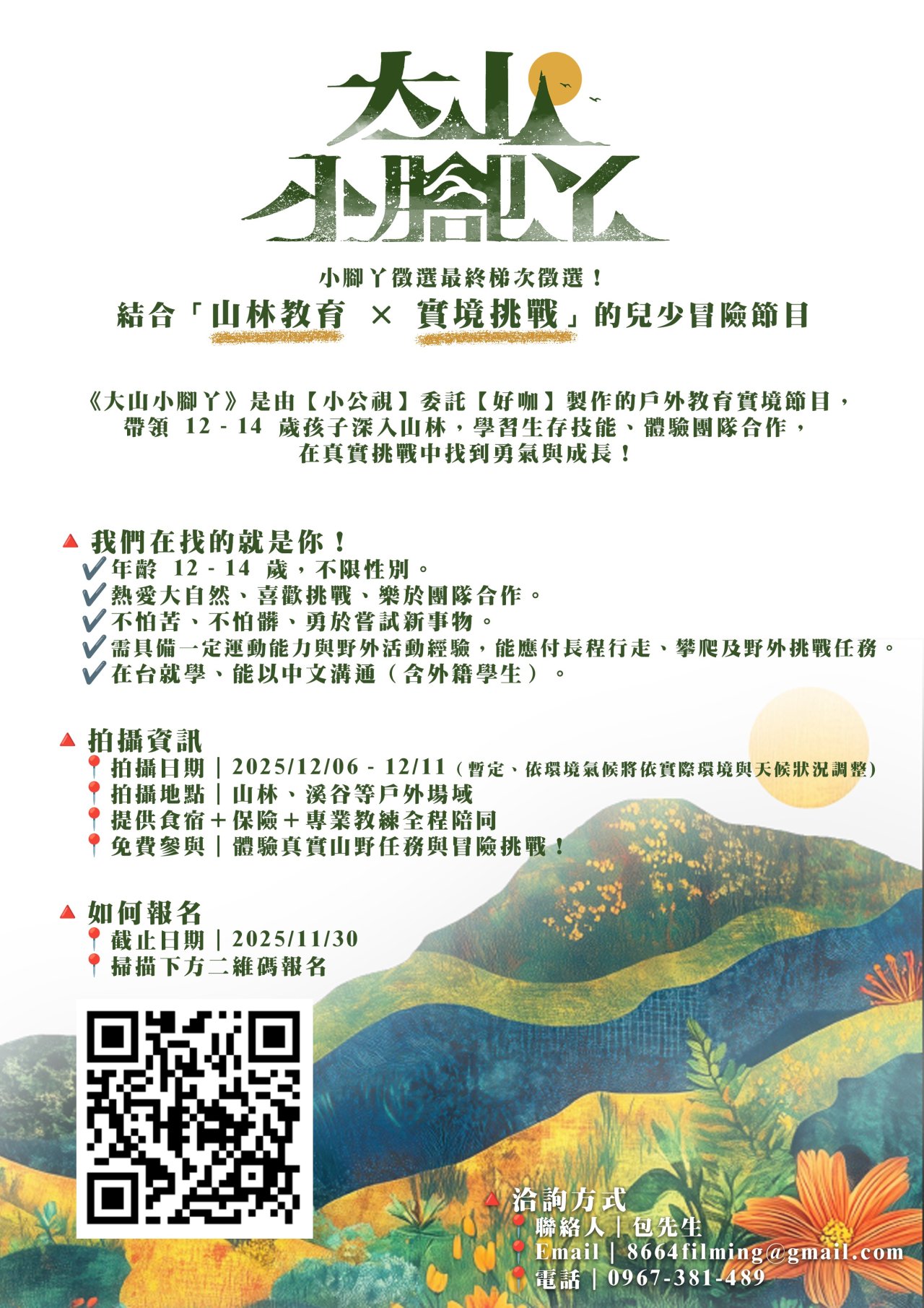 一、節目【大山小腳丫】是一檔兒少體驗實境節目,融合挑戰性與教育娛樂性,旨在帶領青少年探索山裡的自然,培養生存技能與團隊合作精神。