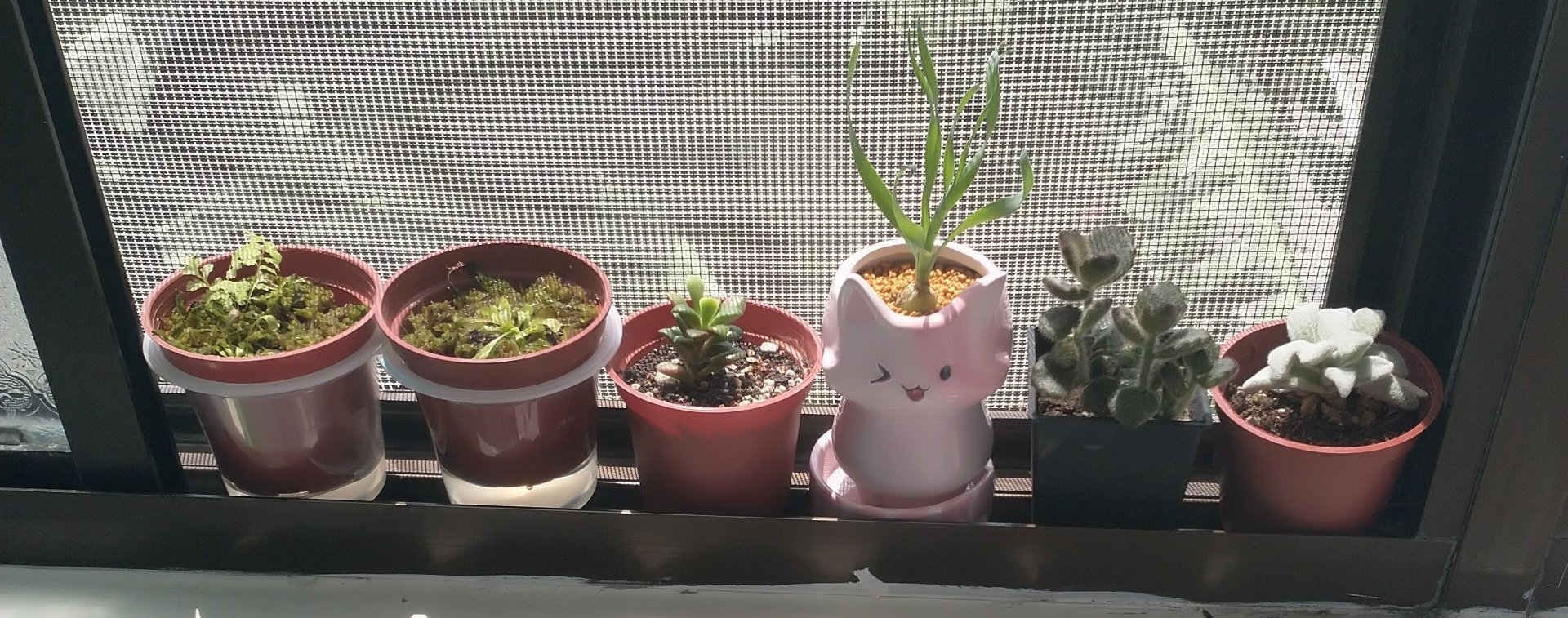 媽媽在陽台養了一些植物,有爪子很小的捕蠅草、兔耳系列、生石花、仙人掌、紫帝玉、毛漢尼、左手香、迷迭香、薄荷、寬葉彈簧草、迷你玫瑰,還有我在學校戶外教學拿回來的酒瓶蘭。