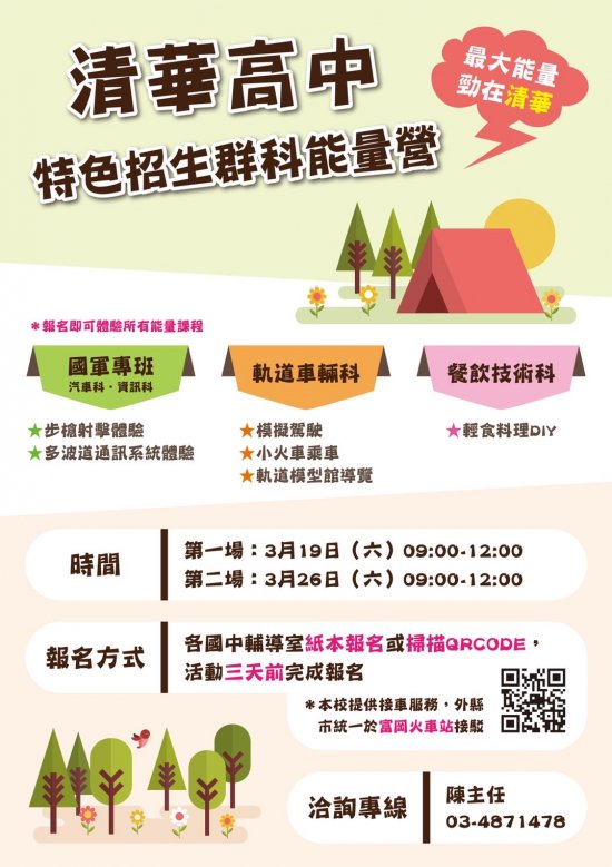 一、本校辦理特色招生群科能量體驗營時間:(一)第一場:03/19(六)09 : 00~12 : 00 。(二)第二場:03/26(六)09 : 00~12 : 00 。