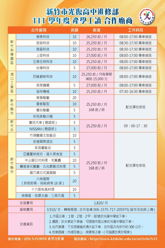 (一)請協助將資料轉知適性學生,由學生網路預約,由本校回電說明。電話: 03-5753628 及 03-5353637 ,報名預約請搜尋//光復高中首頁/新生線上預約系統/進修部(產學工讀)。 http://www.kfsh.hc.edu.tw/article/543 。