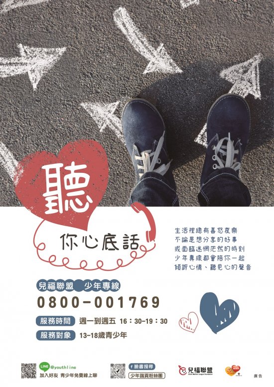 說明: 一、本會辦理「兒福聯盟-少年專線服務( 0800-001769 )」,提供 13 歲至 18 歲之青少年免付費電話諮詢服務,服務時間為每週一至週五下午 4 : 30 至 7 : 30 。期待透過此專線傾聽少年的需求,與少年討論其所面臨的問題,協助其抒發壓力,並引導、陪伴他們面對和解決困難。 二、請惠予協助將 DM 電子檔公告於學校官網及班級群組。 三、業務聯絡人劉聖芬社工員,電話 04-22265905 分機 21 。