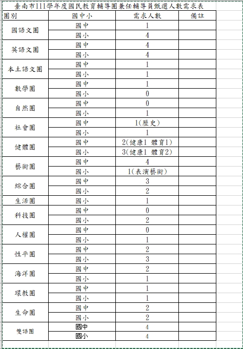 四、檢附「臺南市 111 學年度國民教育輔導團-兼任輔導員甄選簡章」1 份及各領域及議題團需求人數表。