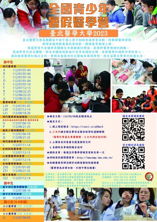 二、營隊資訊: 2023 暑期醫學營擬訂於民國 112 年 7 月 1 日至 8 月 25 日辦理。網址 http://tmucamp.tmu.edu.tw/