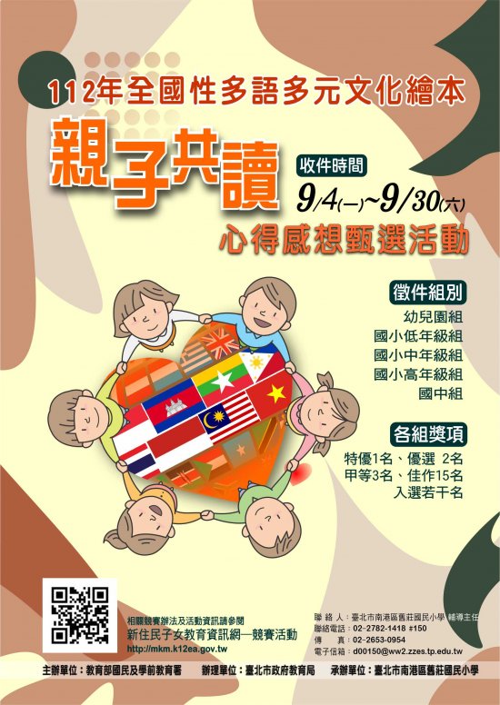2、若學校統一報名請以學校為單位,統一將上述已簽名之授權同意書寄送臺北市南港區舊莊國小輔導室( 11572 臺北市南港區舊莊街一段 100 號),請載明報名「全國性多語多元文化繪本親子共讀心得感想甄選」。