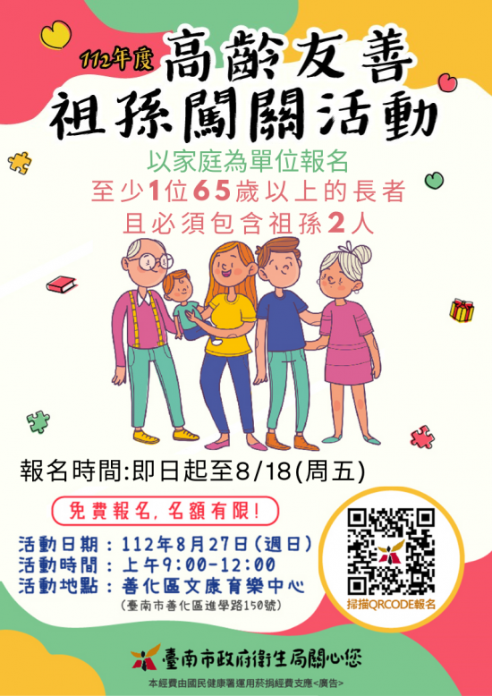 二、為了倡導家庭世代同樂,增進祖孫相處時光,本局結合「祖父母節」辦理「高齡友善祖孫闖關活動」,活動包含挖寶總動員、記憶力大考驗、營養知多少等關卡。