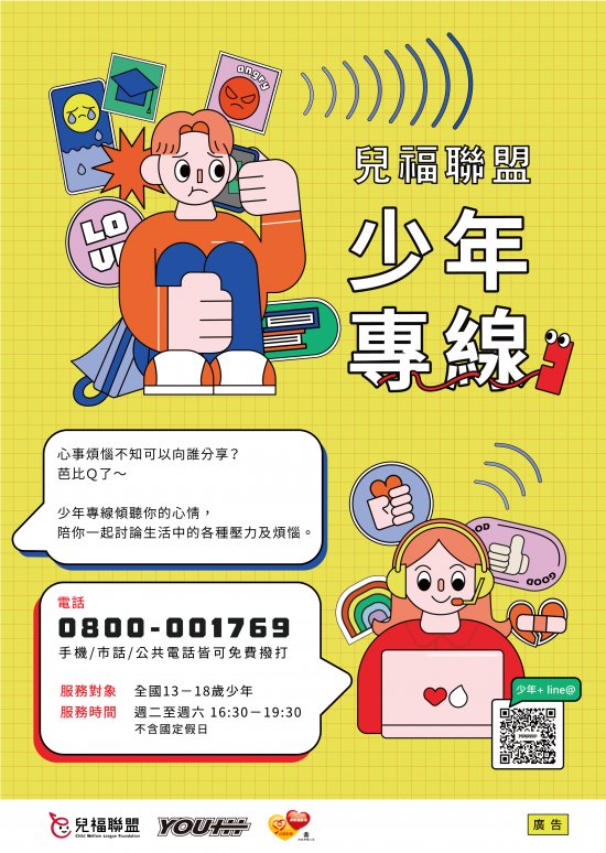一、本會辦理「兒福聯盟-少年專線服務( 0800-001769 )」, 提供全台 12 歲至 18 歲之少年免付費電話諮詢服務,服務時 間為每週二至週六下午 4 : 30 至 7 : 30 。期待透過此專線傾 聽少年的需求,協助其抒發壓力,並引導、陪伴他們面對 和解決困難。