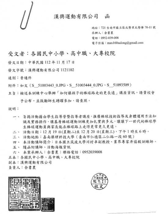 說明: 一、依據漢興運動有限公司 112 年 11 月 17 日漢興運動有限公司 1121102 號函辦理。 二、旨揭講座時間及地點: (一)時間: 112 年 12 月 19 日及 20 日。 (二)地點:嘉南藥理科技大學。 三、檢附講座活動海報及講師簡介各 1 份。 四、本案倘有需詢事項請逕洽漢興運動有限公司余書農教練,聯絡電話: 0952-039008 。