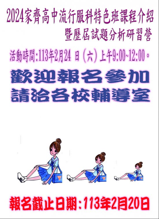 二、謹訂於 113 年 2 月 24 日(週六)舉辦「流行服飾科特色班課程介紹暨歷屆試題分析」研習營。