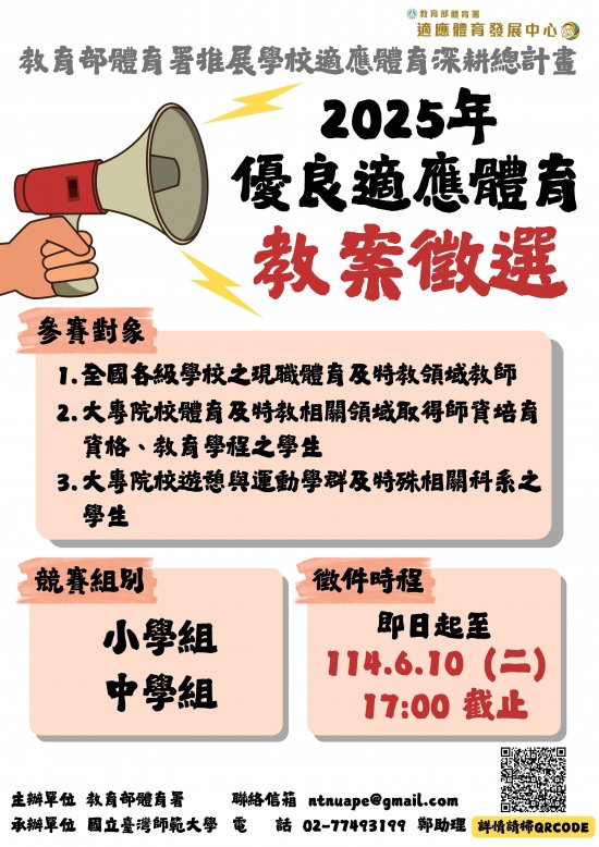 二、為鼓勵特殊教育與運動教育人員研發適應體育教材,將融合概念及身體素養融入各項體育教學活動中,幫助身心障礙學生與一般學生在運動中一起學習與成長,體育署特委請國立臺灣師範大學辦理旨揭活動。