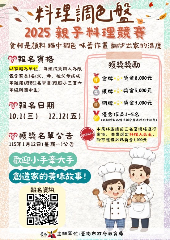 (二)前三名獎金加碼賽:金、銀及銅牌獲獎者應於「臺南市 115 年度(第七屆)學校午餐廚藝競賽」決賽日( 115 年 1 月 27 日),至會場進行得獎作品之現場實作,並由現場人員票選出「人氣料理作品」,即可獲得獎金加碼 1,000 元。