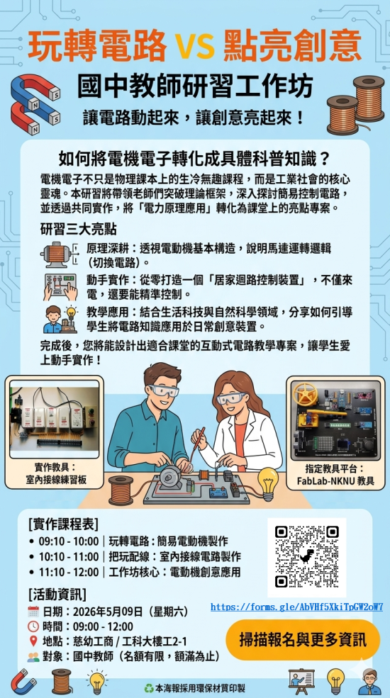 二、協助教師設計教學素材與課程內容,強化教學設計能力,並進一步提升學生核心素養與學習成效,特辦理「玩轉電路 VS 點亮創意」教師研習活動。