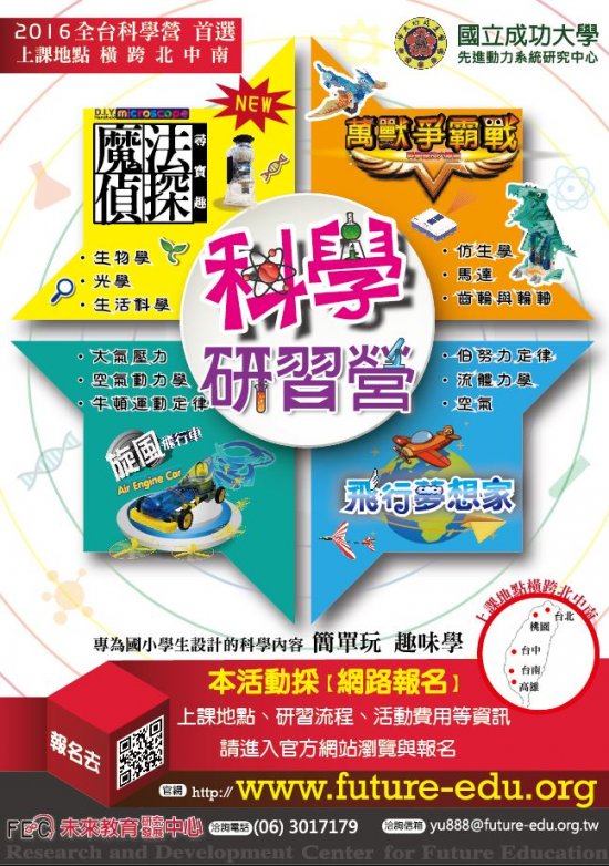 二、該中心與未來教育研究發展中心合作,將於 2016 年 1 月份舉辦「全國中小學未來教育推廣計畫-2016 科學冬令營」,活動預計執行區域:大臺北、桃園、臺中、臺南、高雄等 6 大都,活動簡章如附件,詳細內容請參閱活動網址: http:╱╱http://www.future-edu.org