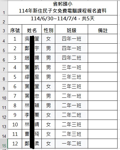 省躬國小 114年新住民子女免費電腦課程錄取名單