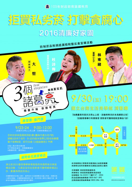 二、財政部南區國稅局於本(105)年 9 月 30 日(星期五)下午 7 時,假國立台南生活美學館演藝廳,結合「故事工廠」劇團演出「三個諸葛亮」劇碼,索取入場券相關訊息如下: