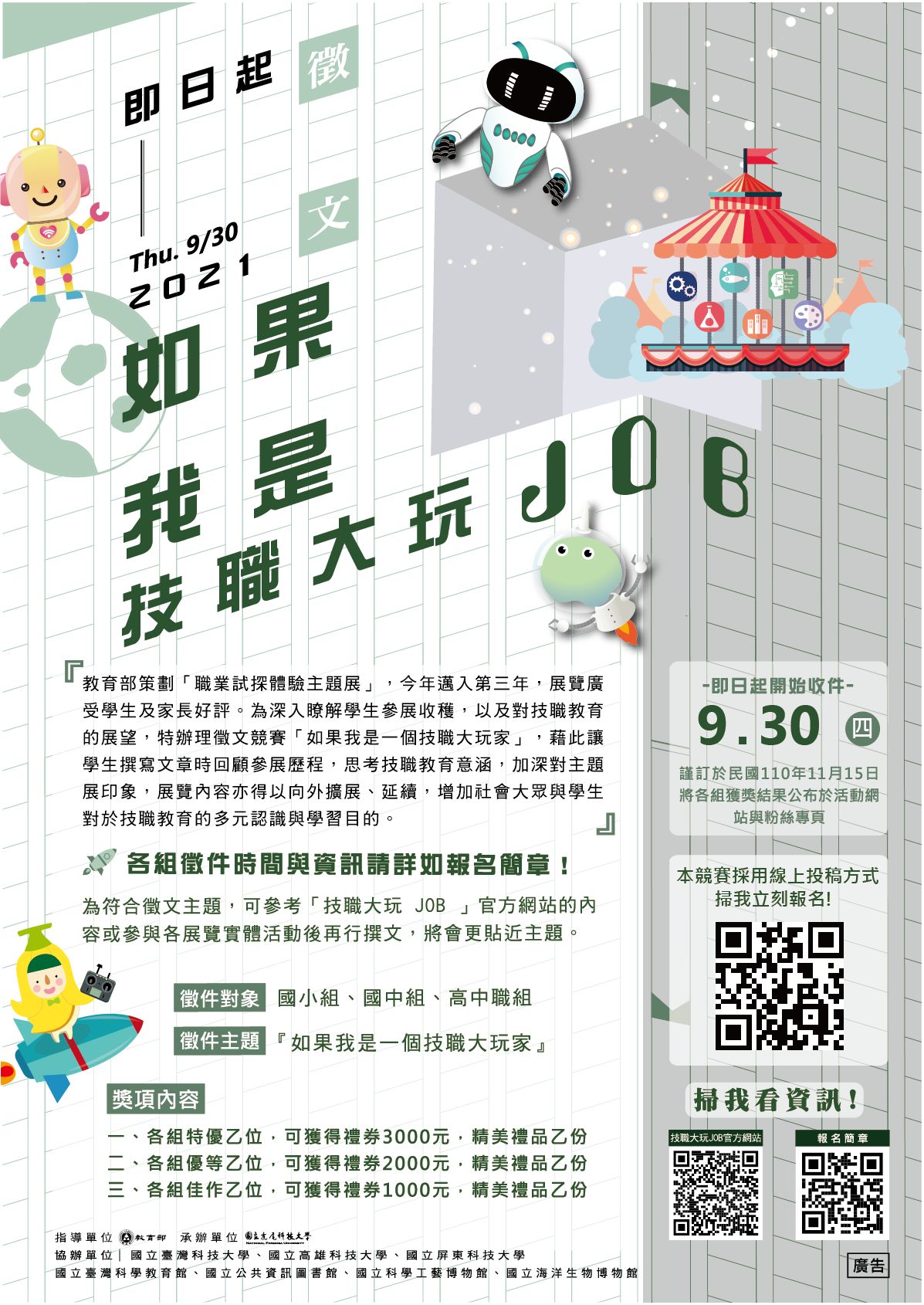 四、為能深入瞭解學生參觀展覽或體驗課程後的收穫,舉辦「如果我是一個技職大玩家」徵文競賽,有意願參加者請於110930日前投稿至Google表單者(https://reurl.cc/ZGErYW ),將有機會獲得1000元至3000元不等的禮券及精美禮品1份。競賽報名詳情,請參閱「技職大玩JOB」網站或「技職動起來」臉書粉絲頁。
